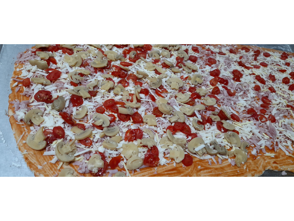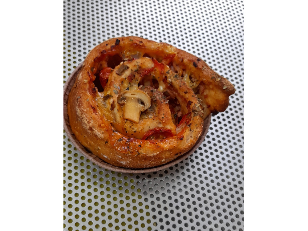 Šunkovo - žampionová pizza "šnek" s rostlinným parmazánem, mozzarellou a goudou, vše bez bílkoviny kravského mléka a bez lepku.