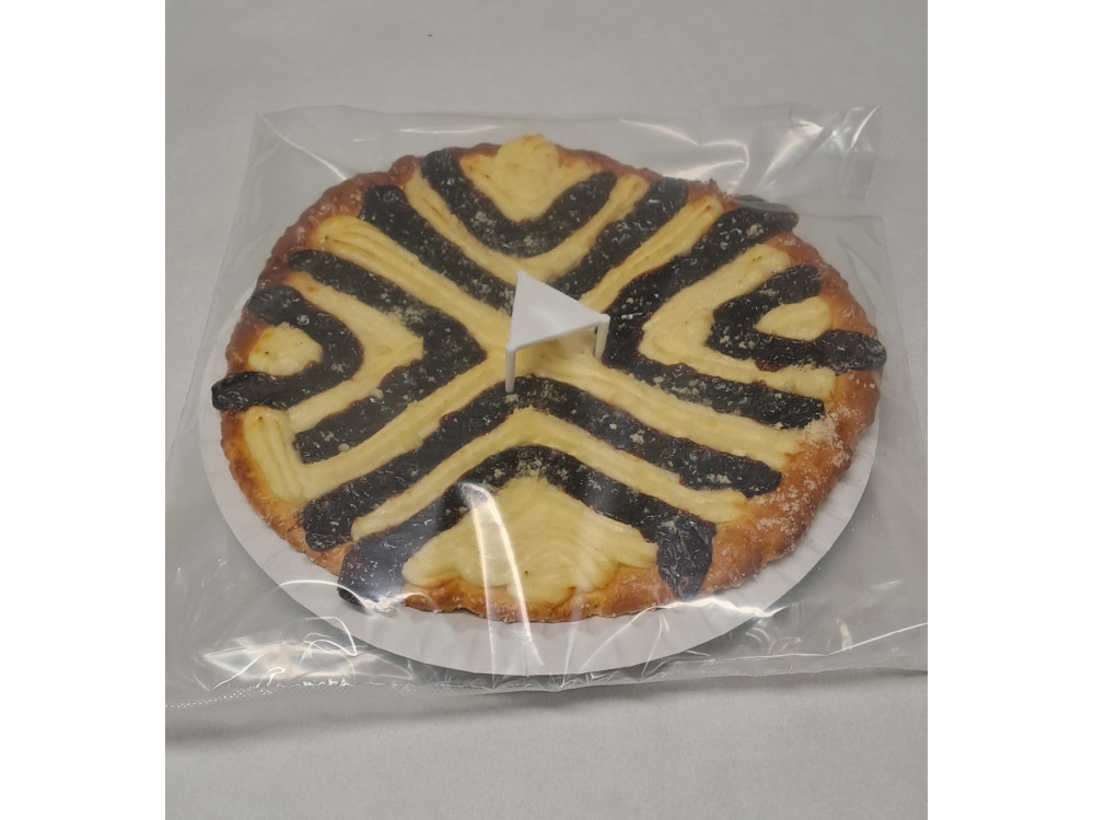 Složení: Těsto: bezlepkový pšeničný škrob, voda, bramborový škrob, cukr, Alsan rostlinný tuk (řepkový, kokosový, palmový), pitná voda, emulgátory(E471, E472c), přírodní aroma, jedlá sůl, kyselina citronová, vitamin A, D, barvivo karoteny, vejce, droždí, zahušťovadlo (E464, xantanová guma), sušený vaječný bílek, emulgátor (E471, sójový lecitin, E481, E475), psyllium, rýžový škrob, sůl, přírodní vanilkové aroma, přírodní citrónové aroma s dalšími přírodními aromaty,enzymy, barvivo karoten. Náplň tvarohová: tvaroh, vaječná melanž, cukr. Povidla: švestkové polotovary (lektvar, sušené švestky), cukr, želírující látka: pektin, regulátor kyselosti: kyselina citronová, barvivo: karamel. Drobenka: rýžová mouka, cukr, Alsan viz výš.