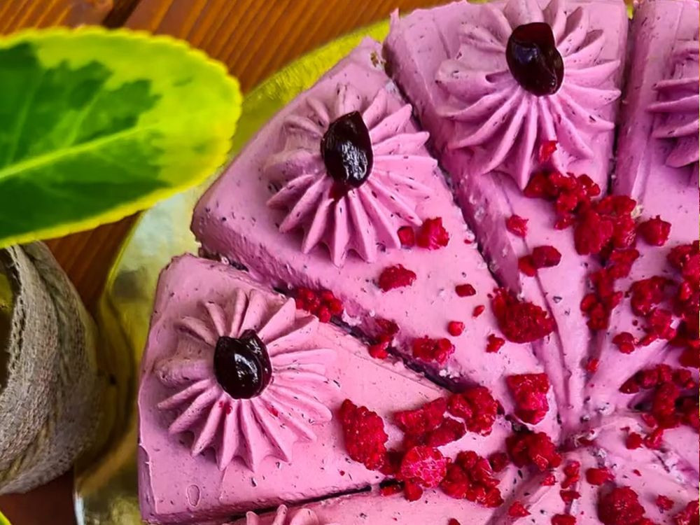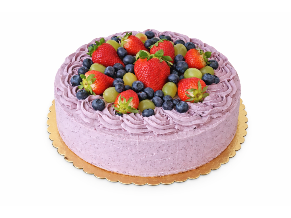 Lehký a svěží dort s nadýchaným bezlepkovým korpusem, promazaný rozvarem z lesních borůvek a jemným veganským smetanovým krémem, prokládaný čerstvým ovocem.