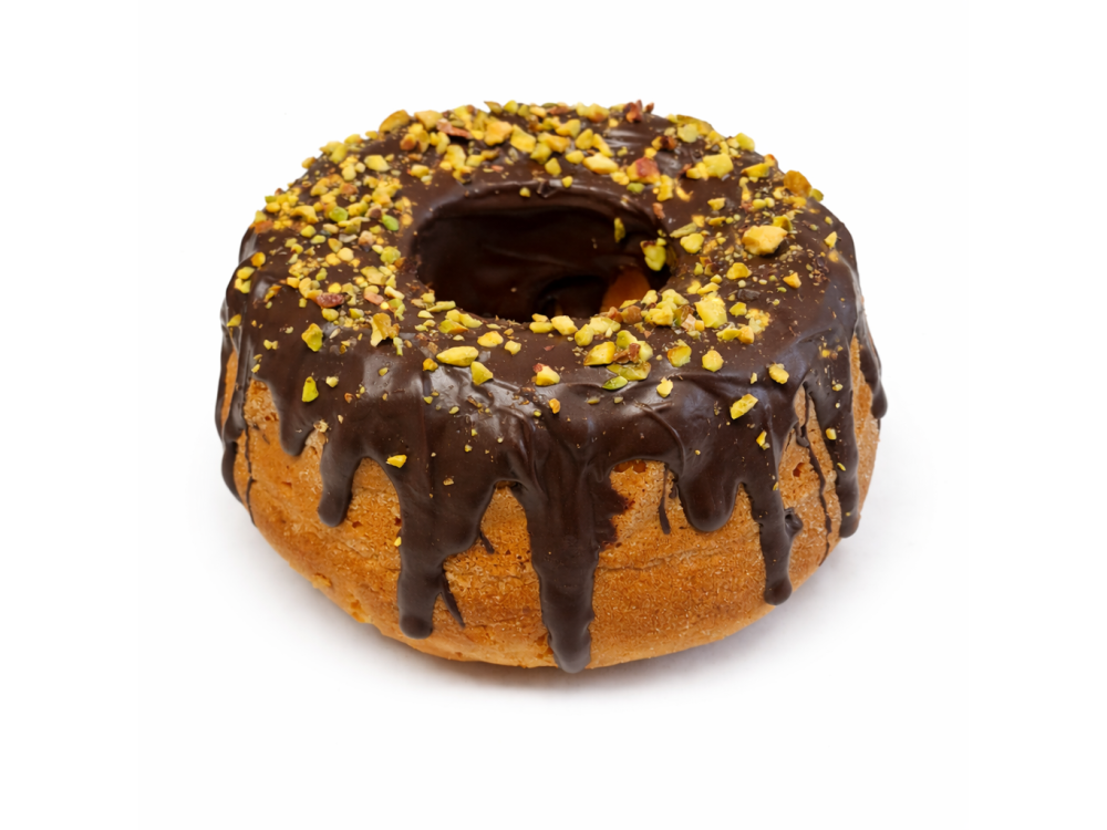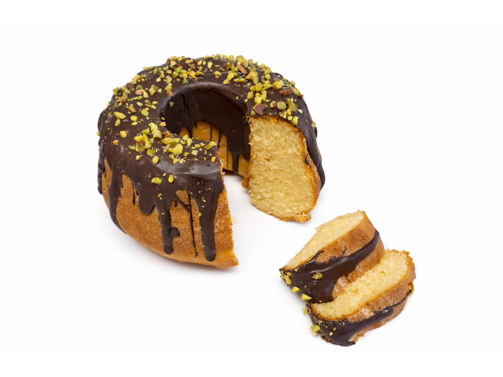 Vláčná bábovka politá čokoládou a posypaná pistáciemi.